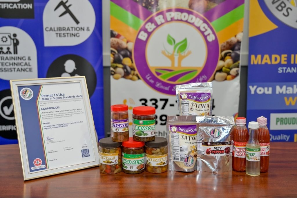 The Guyana National Bureau of Standards (GNBS) on Wednesday, November 27, 2024, certified B & R Products under the ‘Permit to use the Made in Guyana Certification Mark’ programme, bringing the total number of certified local manufacturers to fifty (50). The business is now permitted to use the GNBS Approved Made in Guyana Standards Mark on their Mango Achar, Pepper Sauce, Coconut Oil, Dry Peppers, Satwa and Pickles under the Intrinsic Quality brand name.