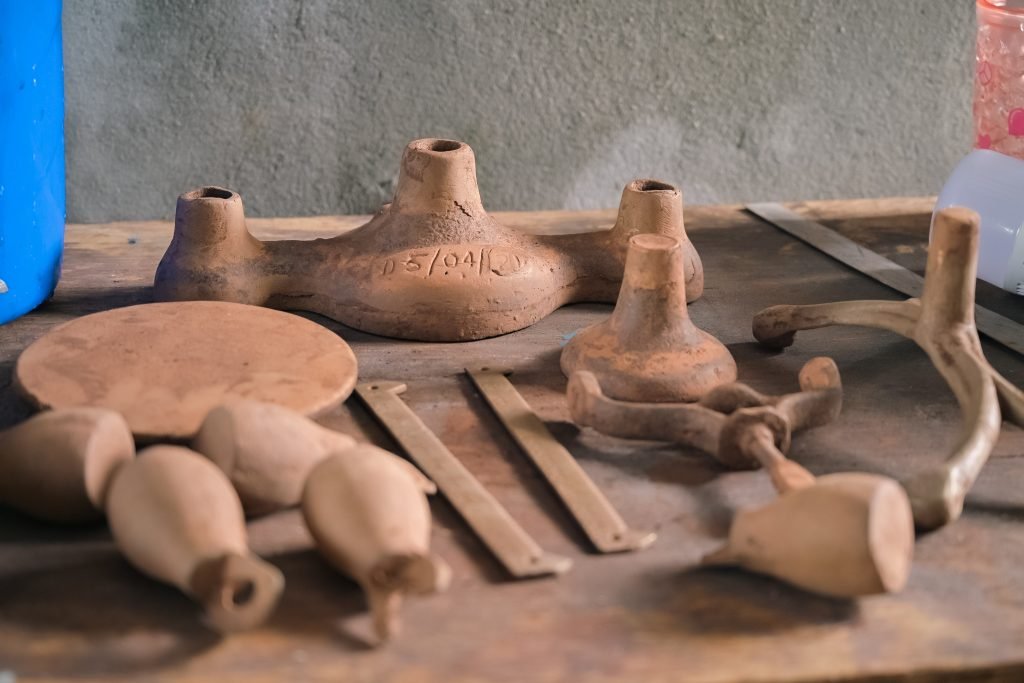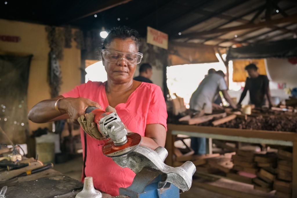 With the assistance from one of her sons, Dularie purchase scrap metals from citizens across the country which she then melts to produce the scales. The metal is melted over a fireplace and then poured into a mould made from sand. The sand moulding technique is commonly used for small-scale production since it is cost effective and can be done in a short period of time with reusable patterns.