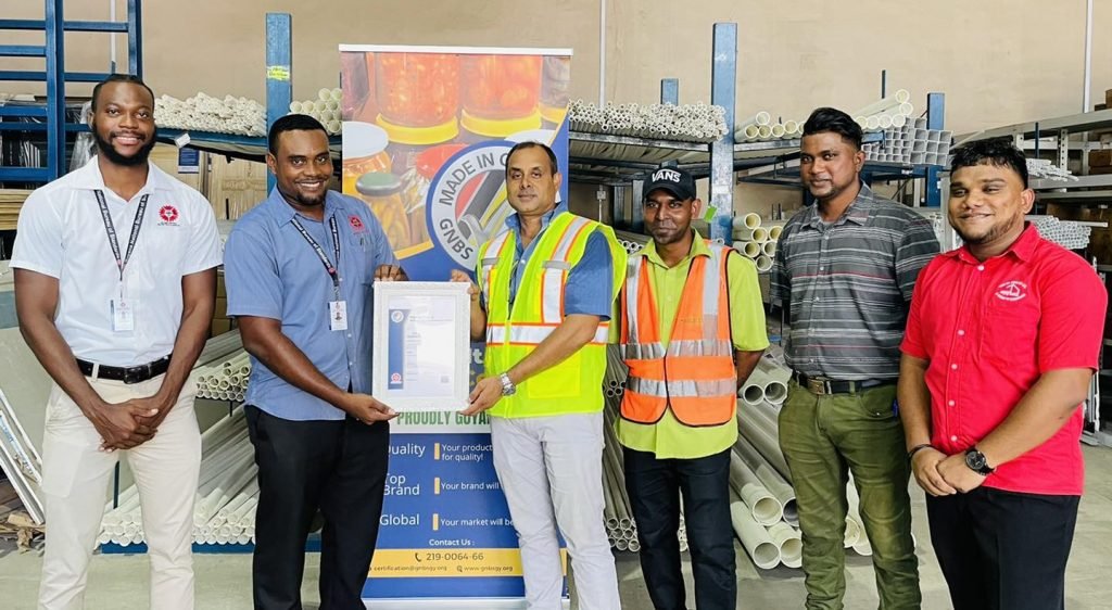 At a simple ceremony hosted at the company’s Providence, East Bank Demerara location, Director of Guyana Thermoplastic Limited (Toolsie Persaud Group of Companies) Mr. Vinod Persaud, pridefully stated “as a company, we have always been focused on quality and we are delighted to join other local manufacturing companies that have been recognised and certified to use the Made in Guyana Standards mark…” He added that his company looks forward to continued work with the GNBS Team to implement and improve standards.