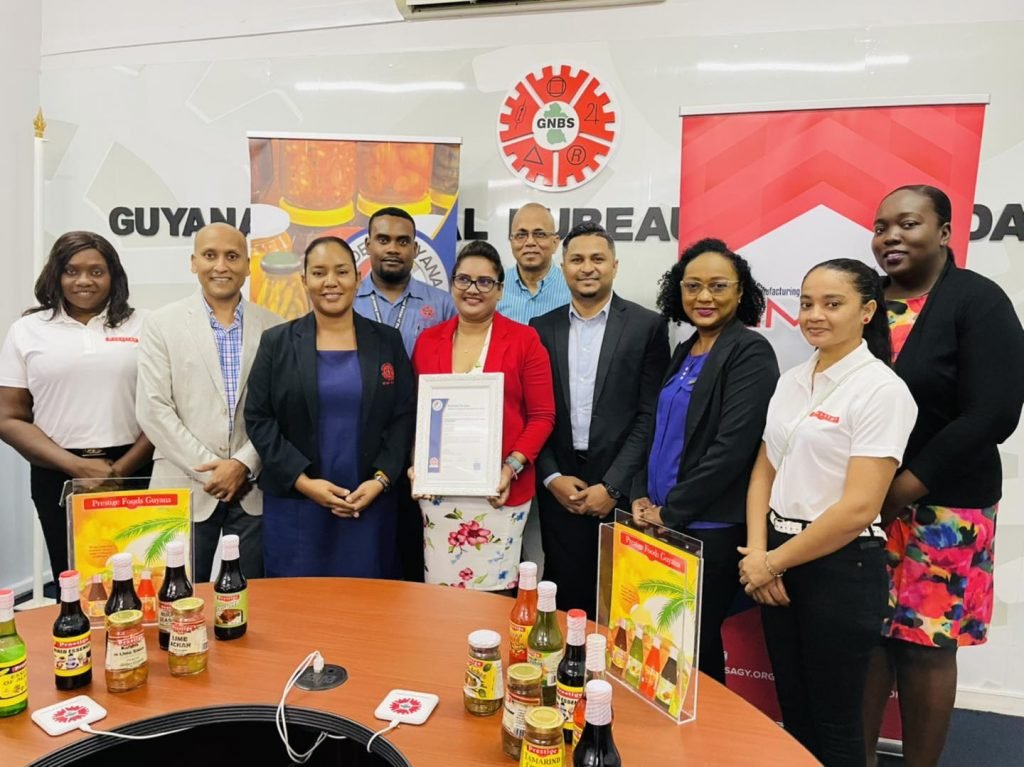 Finally, on Wednesday, November 16, 2022, Prestige Manufacturing & Bottling Enterprise was granted approval to use the Made in Guyana Standards Mark on its hot sauce, mustard oil, mixed essence, almond essence, cake colouring, mango achar, lime achar, tamarind achar, green seasoning, miracle seasoning, cassava cassareep, Chinese sauce, bilimbi achar and koraila in lime.